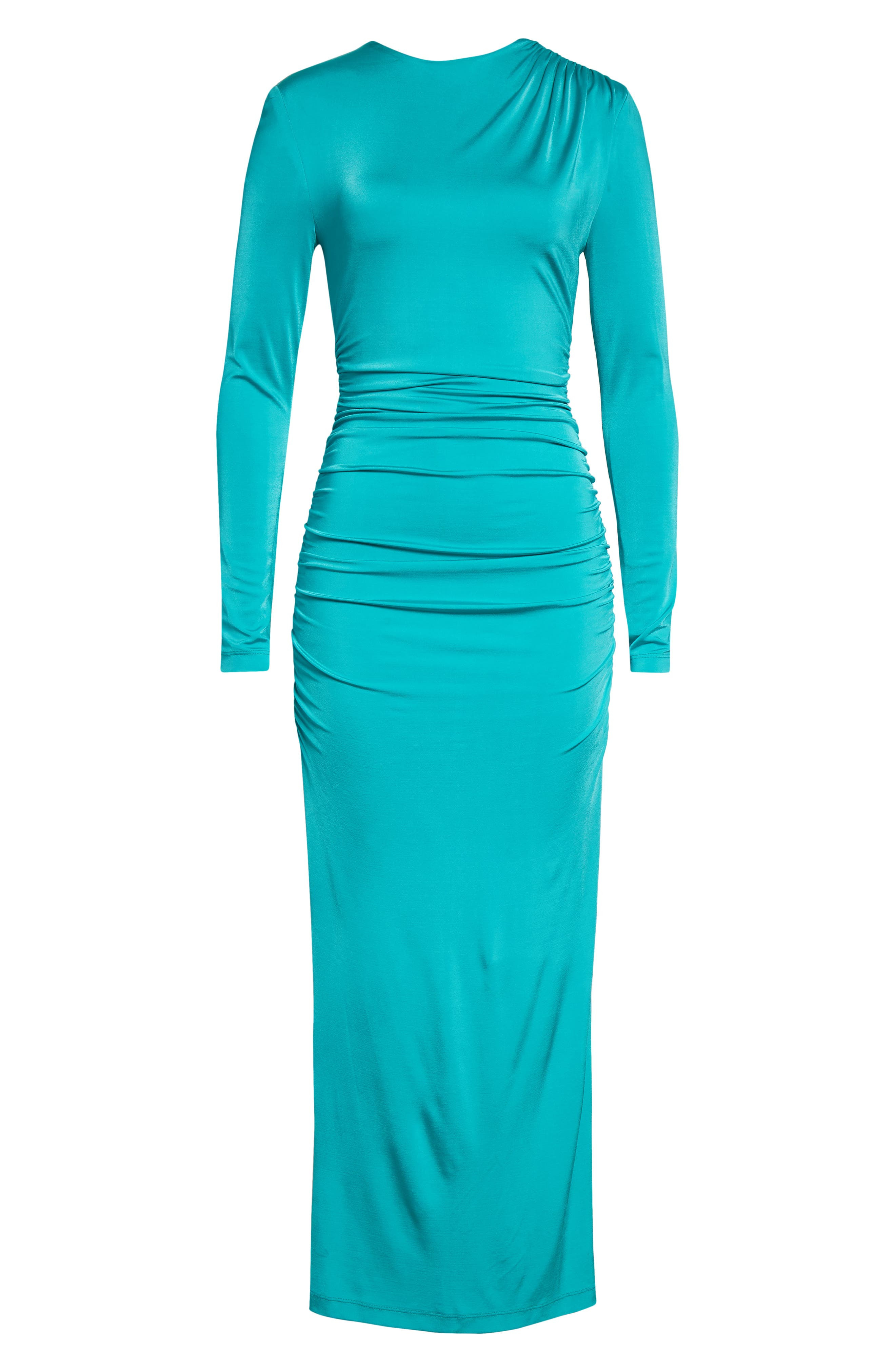Stand out with the vibrant hue of this stretch-jersey dress with ruching at the shoulder, waist and hips for a curve-accentuating fit. Hidden back-zip closure Crewneck Long sleeves Back slit 94% viscose, 6% elastane Dry clean Imported Designer Clothing Hispanic & Latinx Owned/Founded