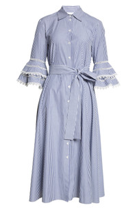 Carolina Herrera Stripe Tiered Ruffle Sleeve Belted Poplin Shirtdress in White/Blue at Nordstrom