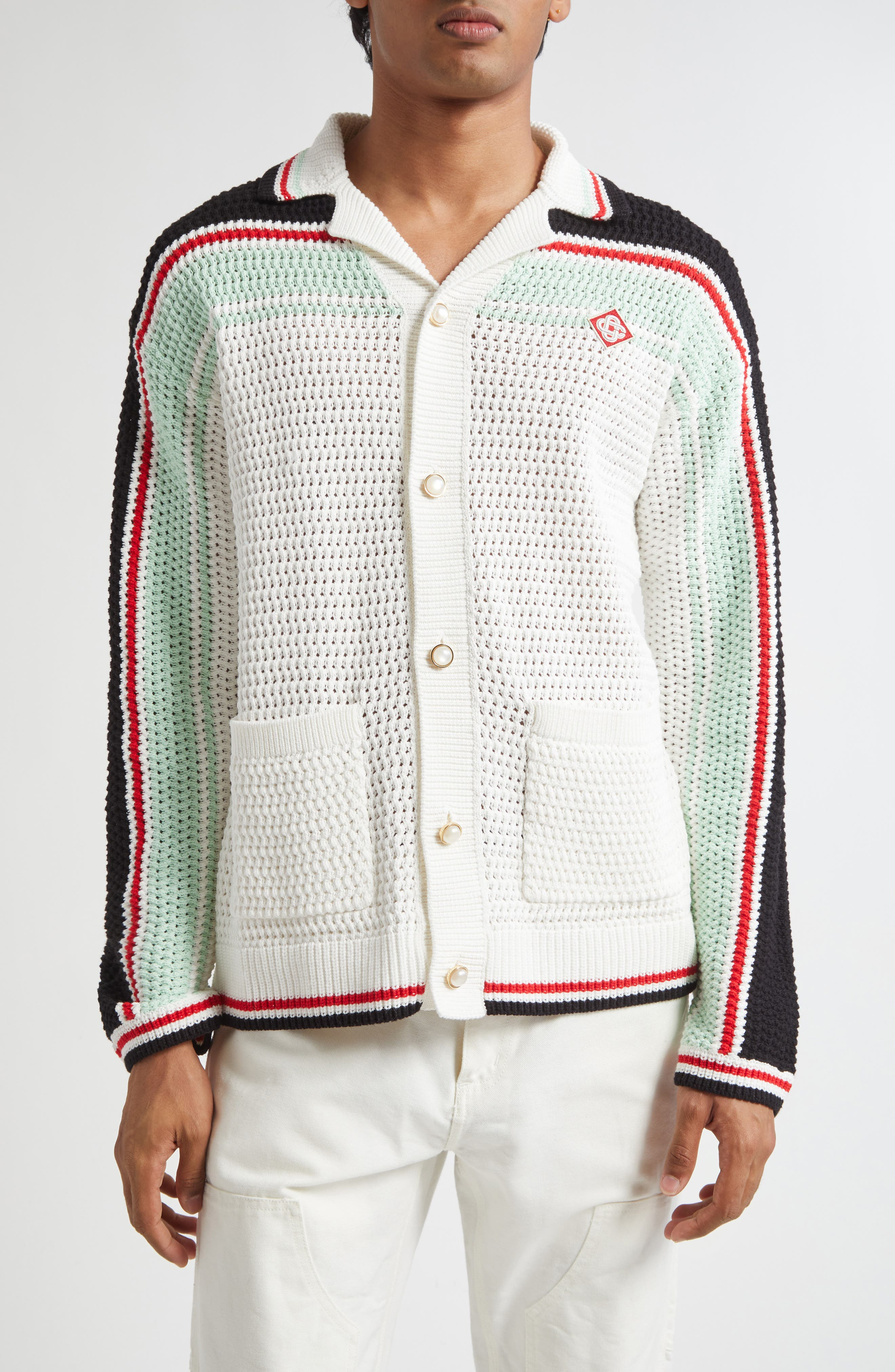 Lightweight cotton crochet invites breezy comfort in a cardigan designed with a relaxed camp collar and long sleeves emphasizing its slightly slouchy fit. Bold colors race up the sleeves and across the shoulders to bring an energetic finish to the resort-ready look. Front button closure Notched collar Long sleeves Ribbed cuffs and hem Front patch pockets 100% cotton Dry clean Imported Designer Clothing