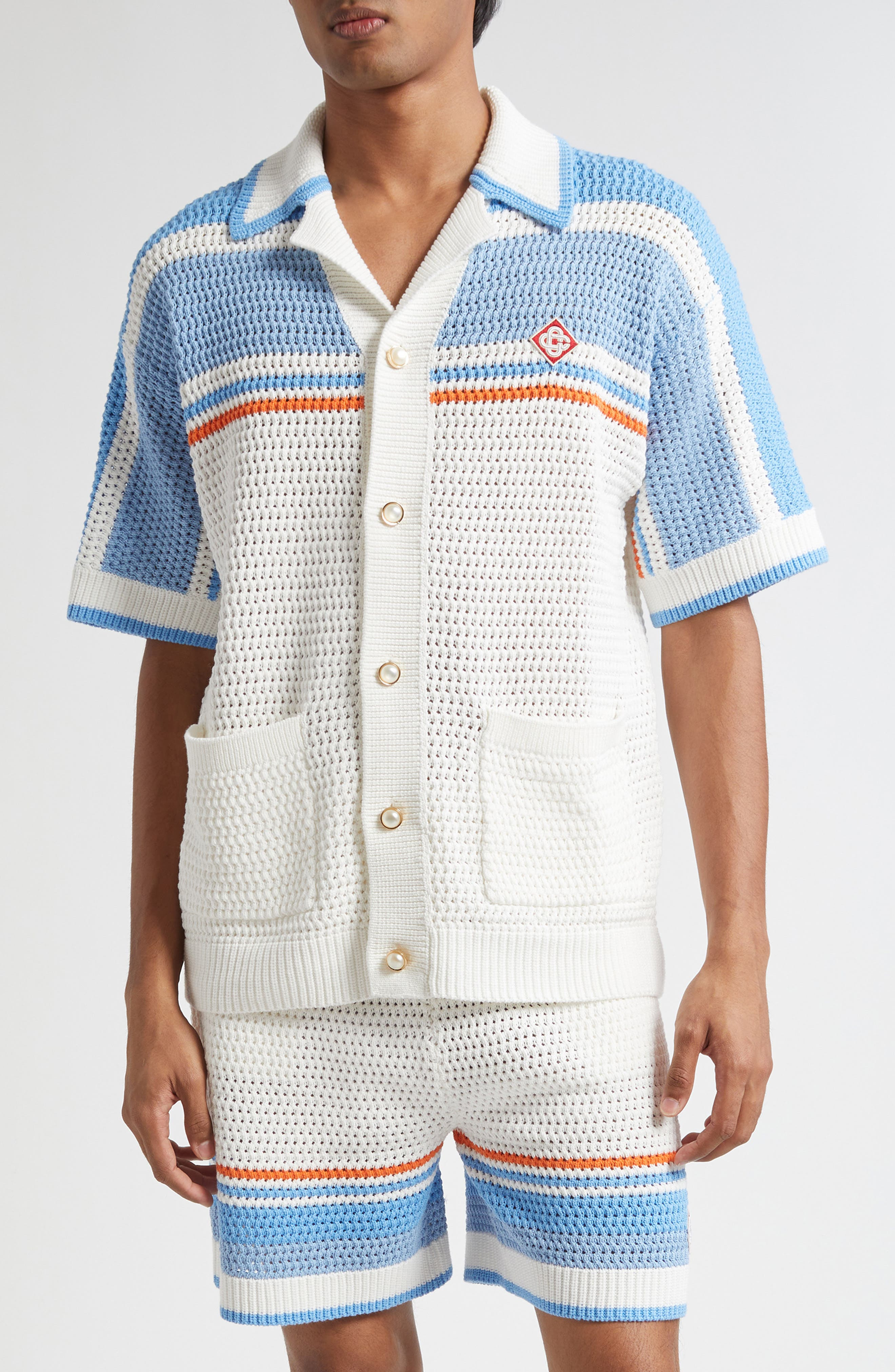 Casablanca Camp Collar Short Sleeve Cotton Crochet Cardigan in Blue Multi at Nordstrom