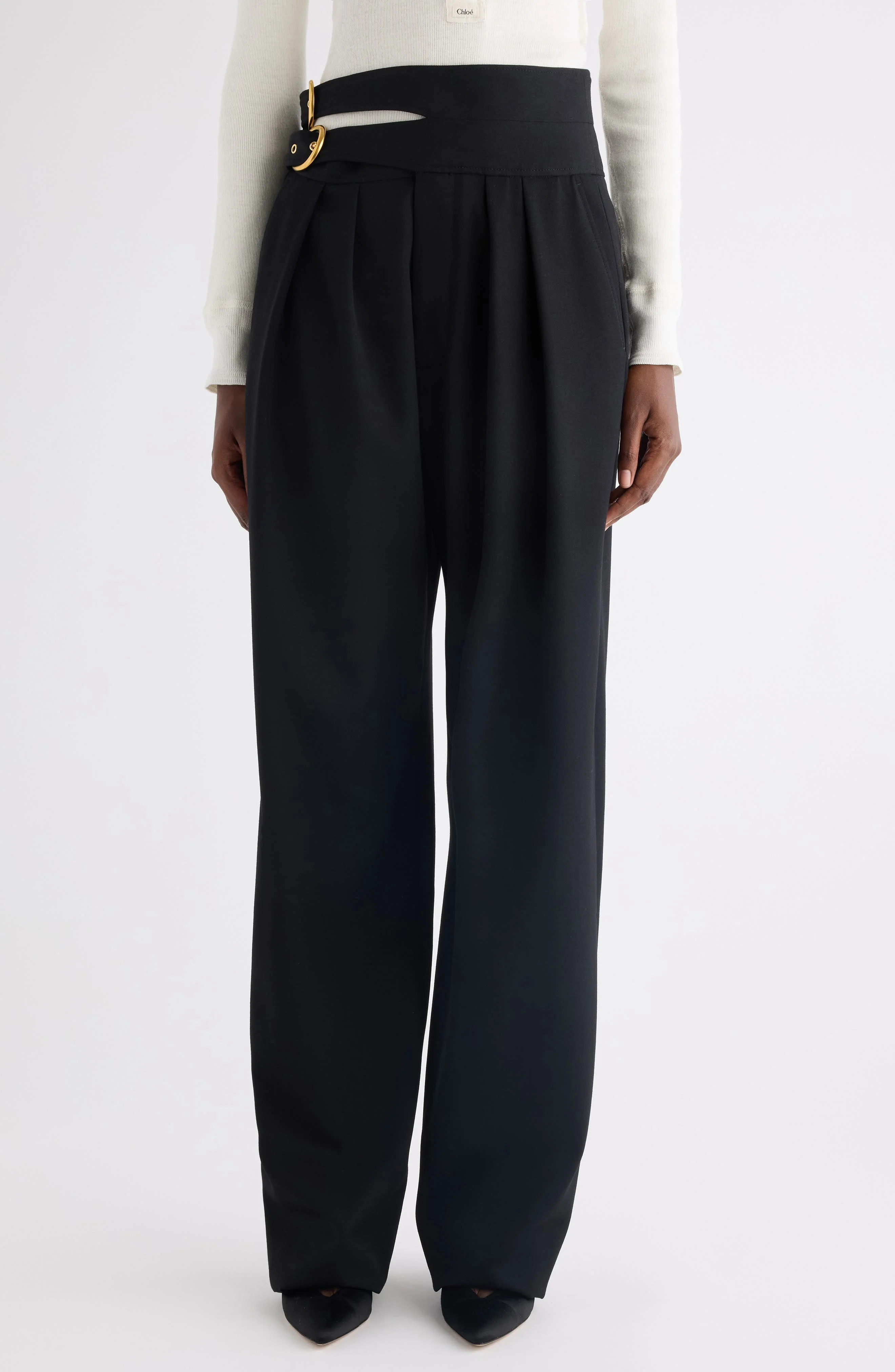 Chloé Buckle Keyhole High Waist Wool Straight Leg Pants in Black at Nordstrom