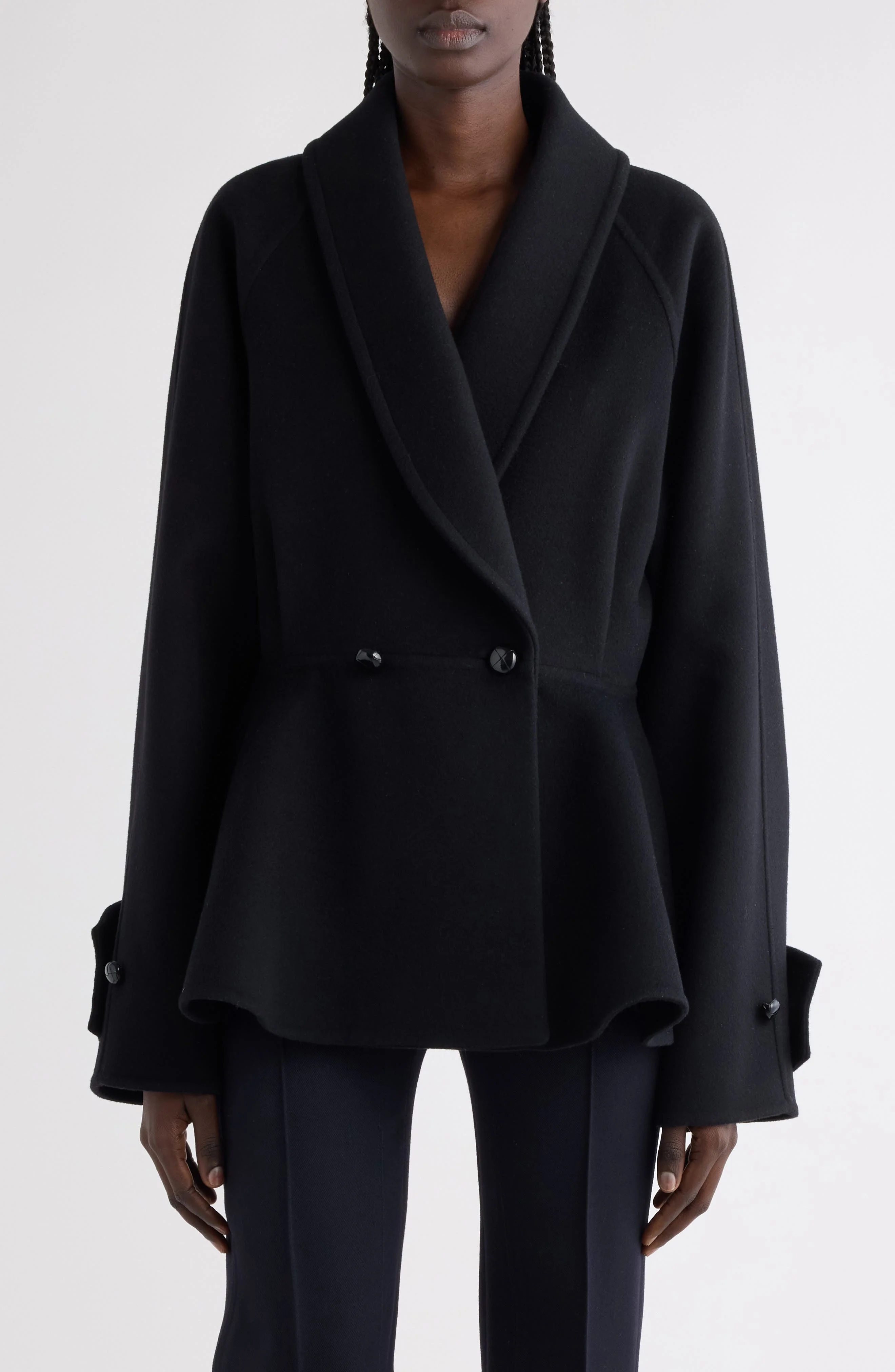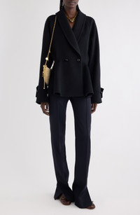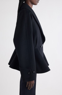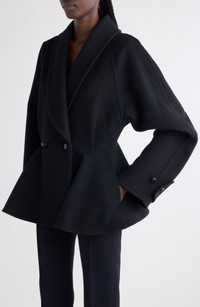 This wool jacket artfully plays with proportions, balancing the drapey raglan sleeves with a voluminous peplum. Double-breasted button closure Shawl collar Adjustable-button cuffs Side-seam pockets Lined 100% wool Dry clean Made in Italy Designer Clothing