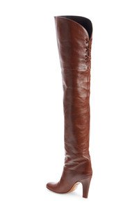 Glinting logo hardware on the sole reveals a subtle heritage touch with every step taken in a '70s-inspired thigh-high boot crafted from Italian leather. Crisscrossing leather laces—another Chloe signature—bridge the back cuff, while a sculpted setback heel adds stable height. Pull-on style Leather upper, lining and sole Made in Italy Designer Shoes