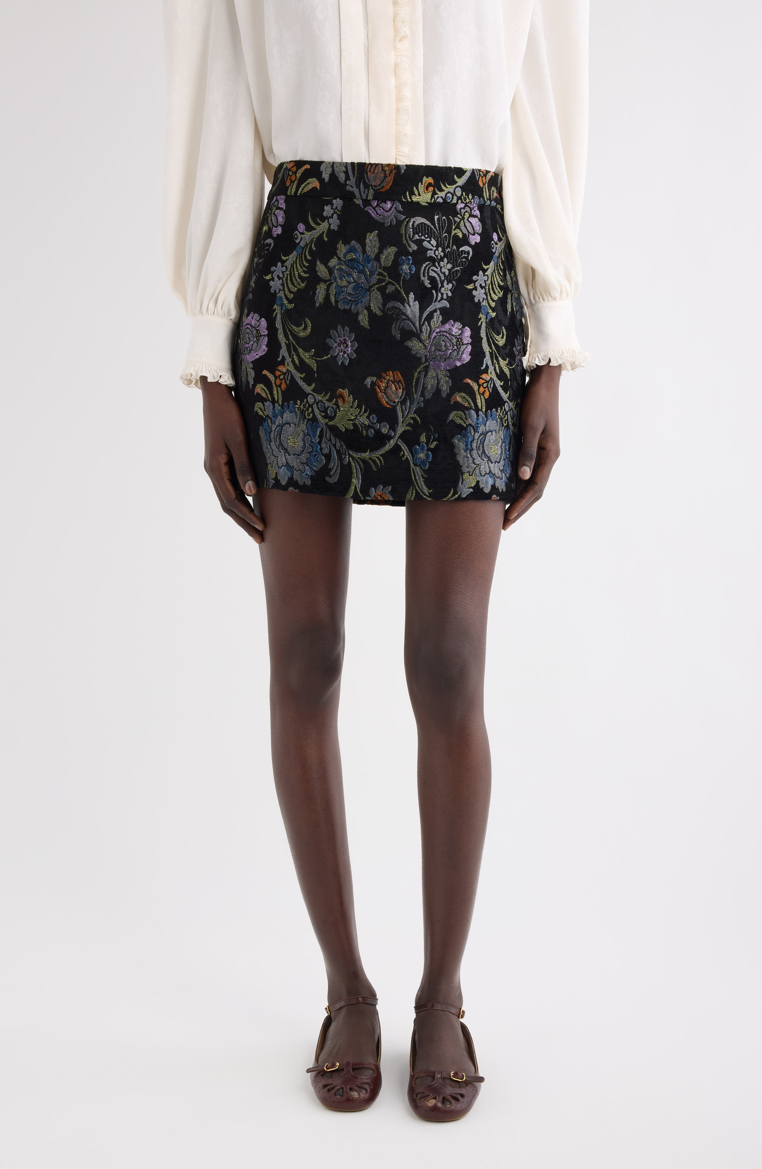 Floral jacquard inspired by classic tapestries brings retro charm to this silk-kissed miniskirt. Hidden side-zip closure Lined 50% viscose, 33% polyester, 9% silk, 8% polyamide Dry clean Made in Italy Designer Clothing