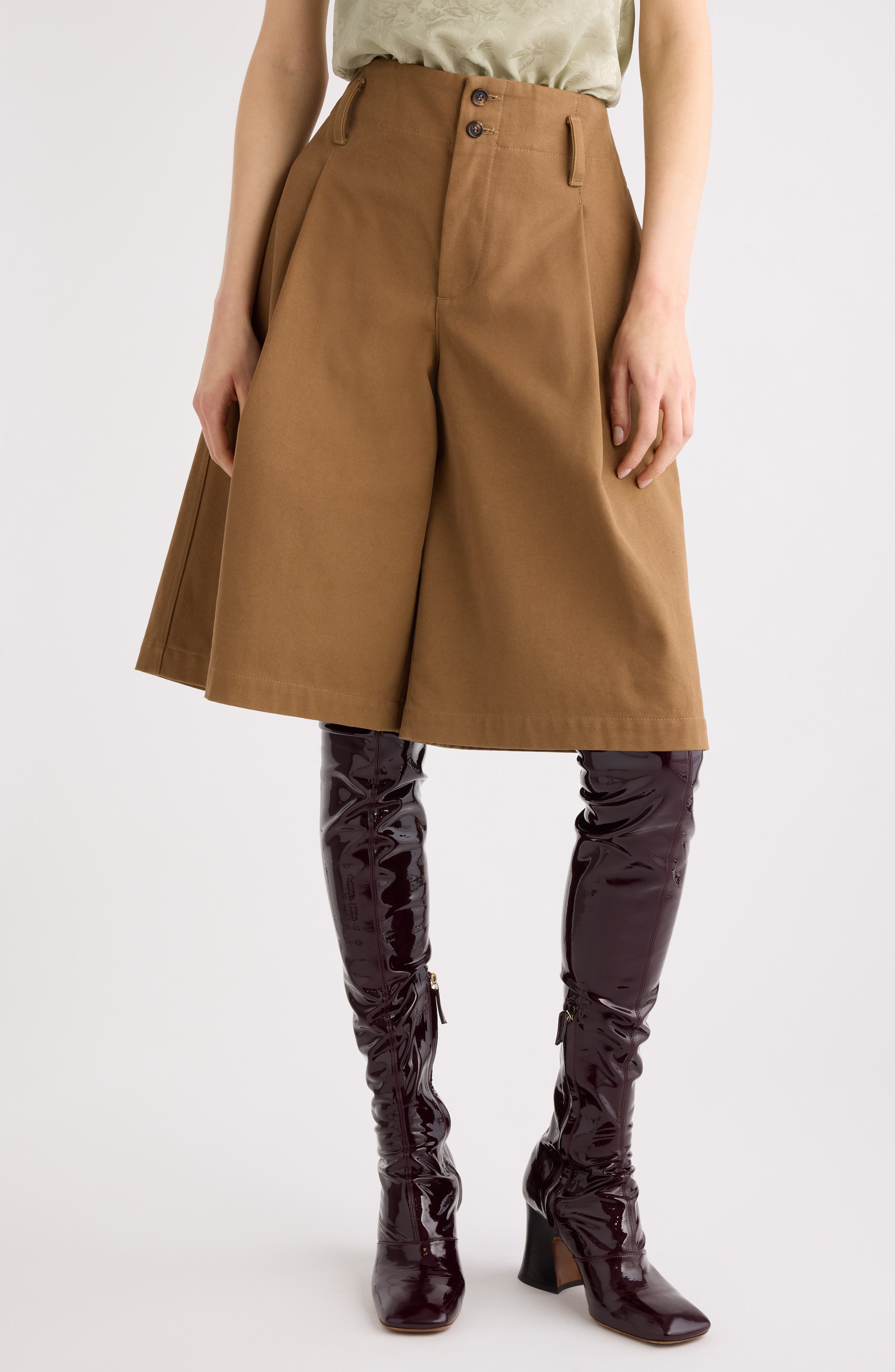 Structured and dramatic, these Italian-crafted Bermuda shorts flow with poetic fullness, thanks to soft front pleats that ripple through the wide-leg silhouette. Made from durable cotton canvas with a subtle structure, their high-rise Hollywood-inspired waist lends a timeless romance to the design. Zip fly with two-button closure Side-seam pockets; back button-welt pockets 100% organic cotton Dry clean Made in Italy Designer Clothing