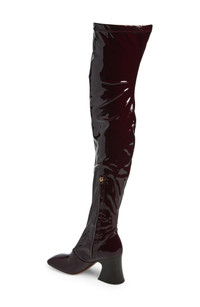 Stand out in this head-turning patent boot designed in a stretchy over-the-knee silhouette framed with a square toe and striking flared heel. 3 1/4" (82mm) heel Inset side-zip closure Polyurethane and textile upper/leather lining and sole Made in Italy Designer Shoes