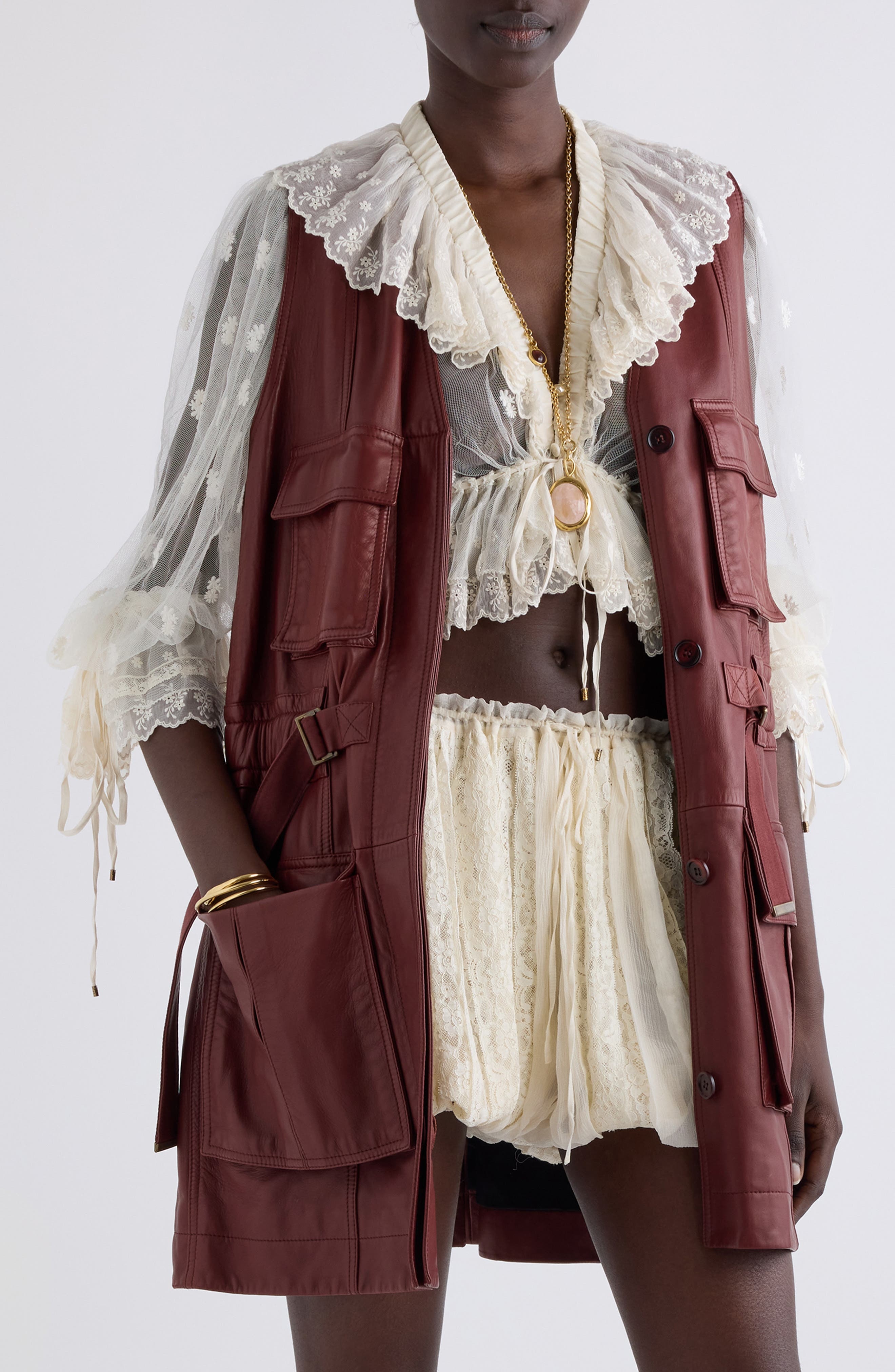 Chemena Kamali reimagines the utilitarian safari jacket with this sleeveless version cut from supple lambskin leather and a featured look on Chloe's spring '25 runway. Hidden-button placket V-neck Sleeveless Chest flap patch pockets; front bellows patch pockets Attached tunneled belt Lined Leather Made in Italy Designer Clothing