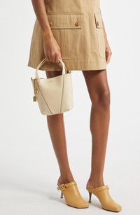 A fresh spin on a classic silhouette, this Italian-calfskin tote features a minimalist silhouette elevated with graphic lines and chain hardware. The scaled-down look gets its name from its creative styling options: either go hands-free with the crossbody strap or slide the handles inside the logo-engraved ring for a new way to carry. Magnetic closure Top carry handles; removable, adjustable crossbody strap Unlined Leather Made in Italy Designer Handbags