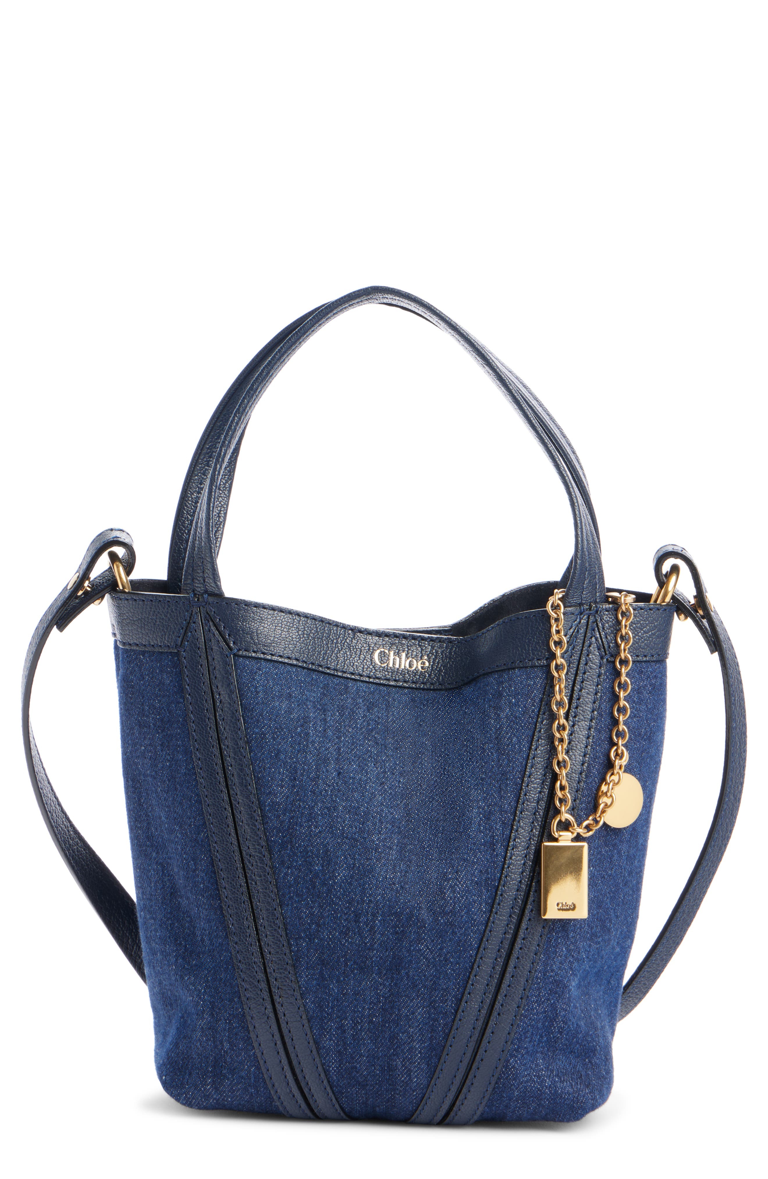 A fresh spin on a classic, this blue-denim tote features a minimalist silhouette elevated with graphic lines of grained leather and charm-embellished chain hardware. The scaled-down look gets its name from its creative styling options: either go hands-free with the crossbody strap or slide the handles inside the logo-engraved ring for a new way to carry. Magnetic closure Top carry handles; removable, adjustable crossbody strap Textile with leather trim Made in Italy Designer Handbags
