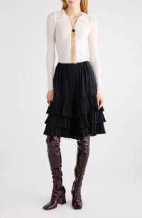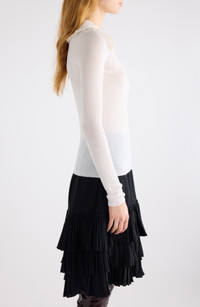 A poetic blend of structure and softness, this rib-knit top embraces the form with superfine wool while a floral-lace collar gives a nod to the label’s signature romantic sensibility. Button half placket Peter Pan collar Long sleeves 100% wool Dry clean Imported Designer Clothing