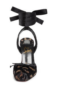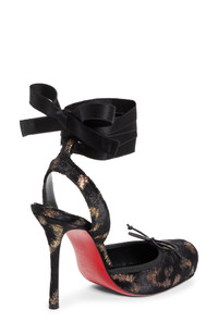 A bow-topped square toe and wraparound ribbon ankle strap bring off-duty ballerina energy to this glittery pump that enhances the elegant line of the leg with a willowy stiletto. 4" (100mm) heel Wraparound ankle strap with tie closure Wipe with a soft, dry cloth and store in a dust bag Please note the red lacquer on soles will wear off as a result of normal use. To minimize the effect, avoid wearing in wet weather or on abrasive surfaces Textile upper/leather lining and sole Made in Italy Designer Shoes
