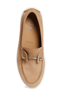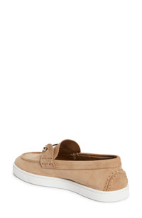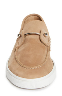 The French label brings bold hardware shine to the boat-shoe silhouette of this suede loafer detailed with a metal collar pin. Christian Louboutin's iconic red sole—updated in rubber with a debossed signature—adds a burst of color to every step. Removable insole Wipe with a soft, dry cloth and store in a dust bag Leather upper and lining/rubber sole Made in Italy Designer Shoes