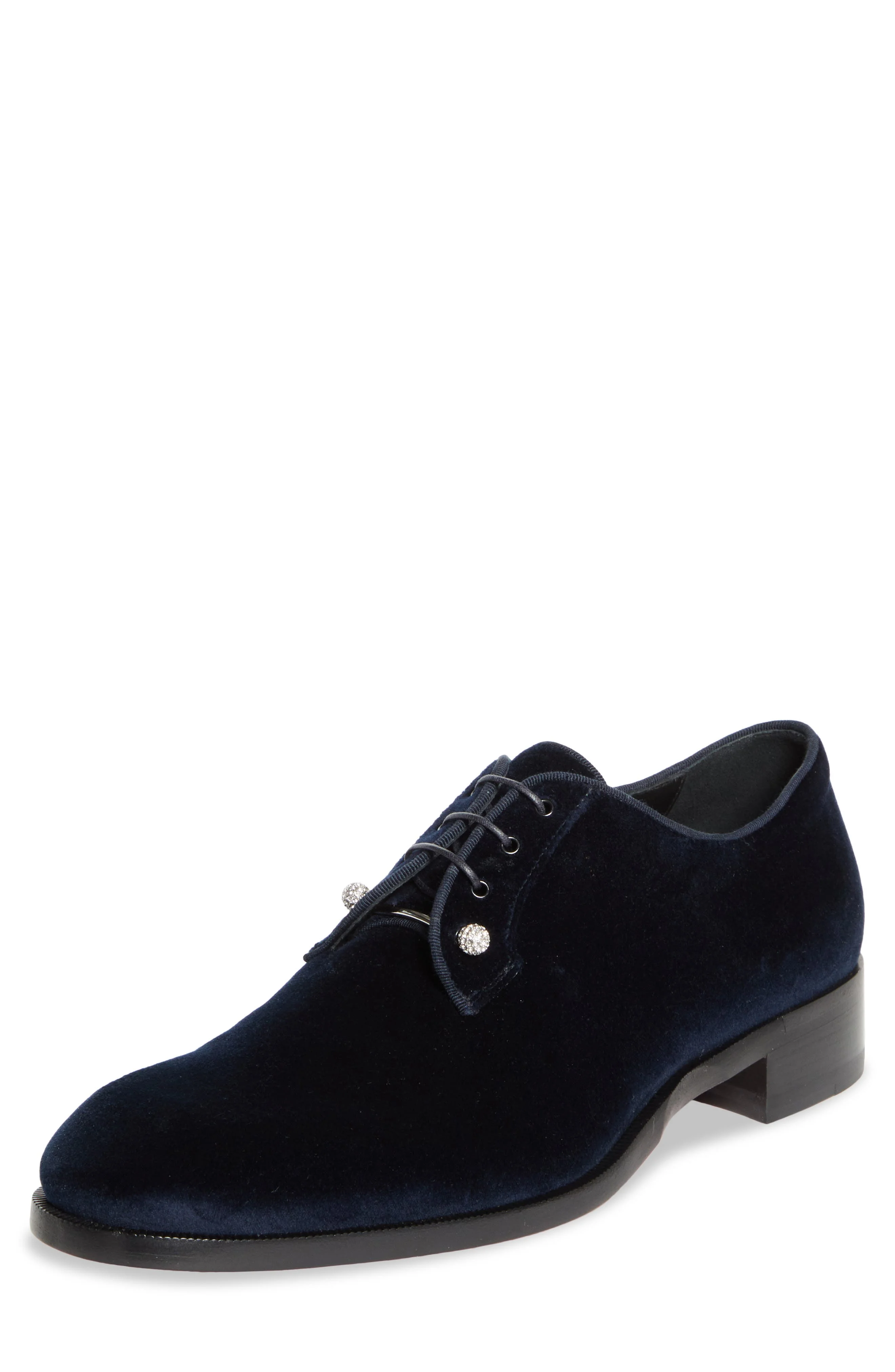 A removable silvertone piercing bar sparked with crystal pave lends subtle edge to this handsome derby crafted of black velvet in a slim profile. A signature Louboutin-red lacquered sole adds a flash of brilliance to every step. Lace-up style Wipe with a soft, dry cloth and store in a dust bag Please note the red lacquer on soles will wear off as a result of normal use. To minimize the effect, avoid wearing in wet weather or on abrasive surfaces Textile upper/leather lining and sole Made in Italy Designer Shoes
