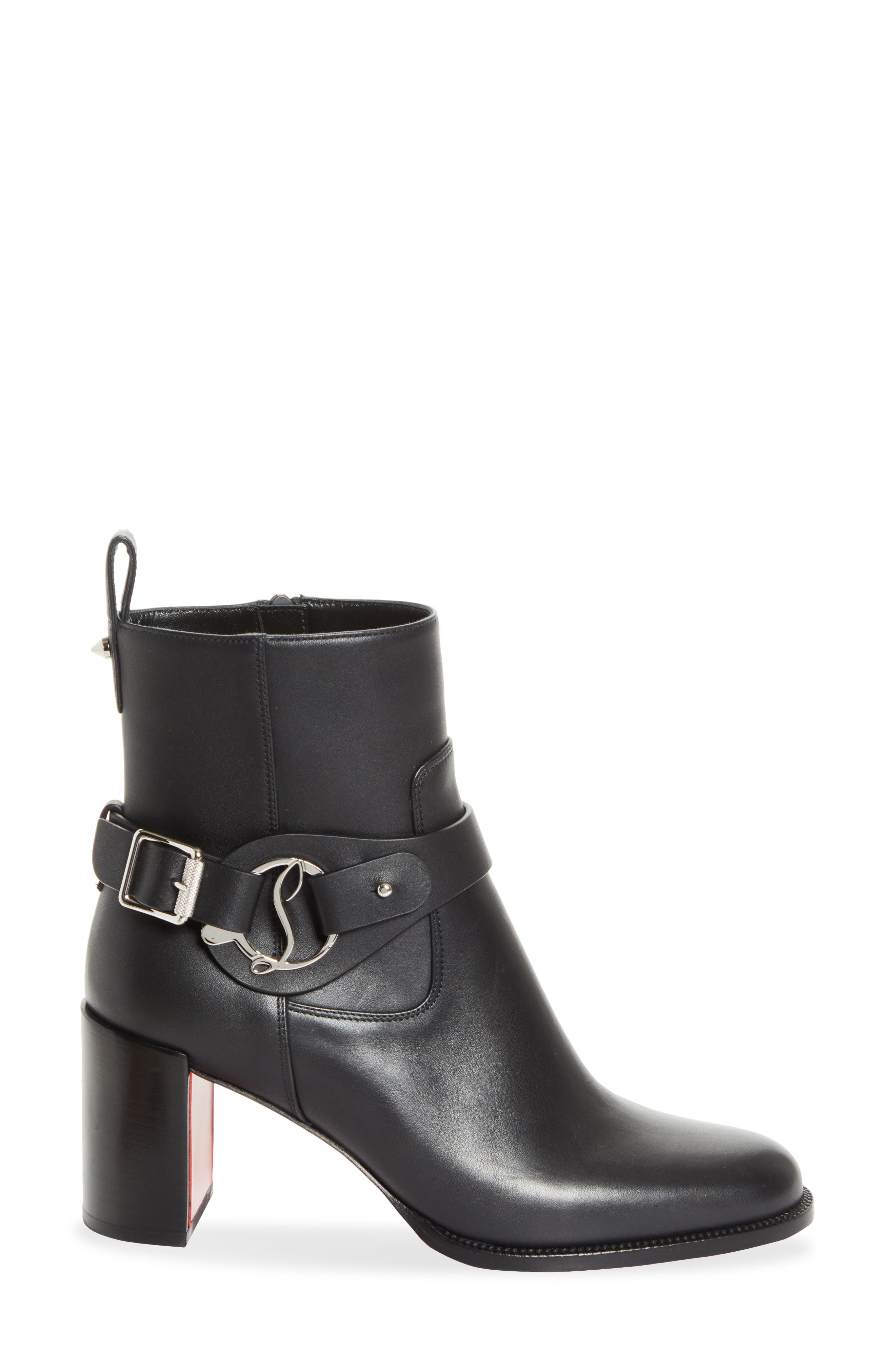 A shaft strap with gleaming Mooncrest and roller-buckle hardware adds edge to this block-heel bootie made from smooth calfskin leather and grounded with a pop of signature red. 2 3/4" (70mm) heel Side zip closure Wipe with a soft, dry cloth and store in a dust bag Please note the red lacquer on soles will wear off as a result of normal use. To minimize the effect, avoid wearing in wet weather or on abrasive surfaces Leather upper and lining/leather and rubber sole Made in Italy Designer Shoes