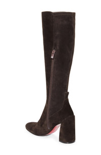 A sculptural block heel brings walkable lift to this minimalist boot crafted from calfskin suede and grounded by that iconic Louboutin-red sole. 3 1/4" (83mm) heel Inset side-zip closure Wipe with a soft, dry cloth and store in a dust bag Please note the red lacquer on soles will wear off as a result of normal use. To minimize the effect, avoid wearing in wet weather or on abrasive surfaces Leather upper, lining and sole Made in Italy Designer Shoes