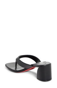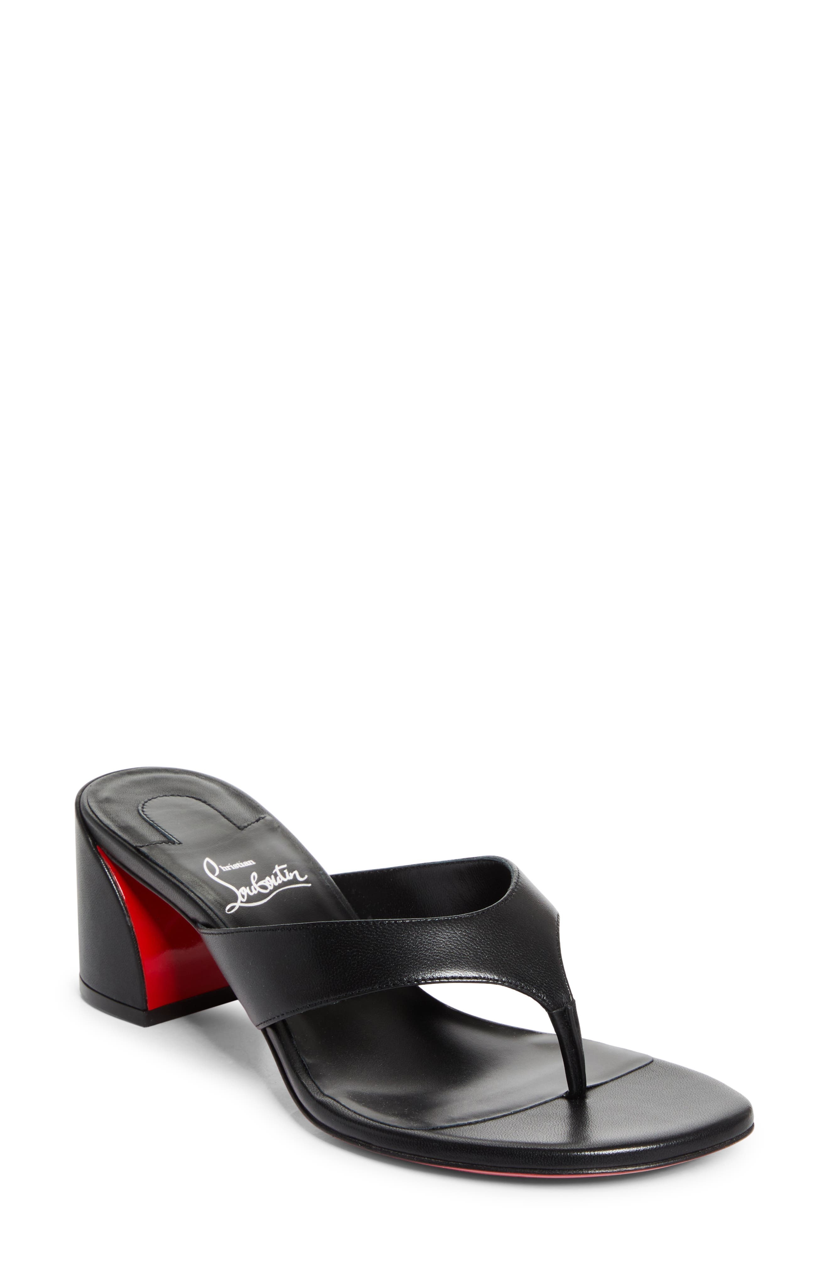 Curved lines give an organic feel to this sandal that elevates the classic thong style with a block heel, Italian leather and signature red sole. 2" (55mm) heel Please note the red lacquer on soles will wear off as a result of normal use. To minimize the effect, avoid wearing in wet weather or on abrasive surfaces Wipe with a soft, dry cloth and store in a dust bag Leather upper and lining/synthetic sole Made in Italy Designer Shoes
