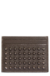 Tonal cone studs punctuate the pebbled exterior of a slim leather card case framed in a pinstripe of signature red. 4"H x 3"W x 1/8"D Four exterior card slots; center slip pocket Leather Made in Italy