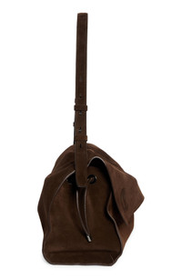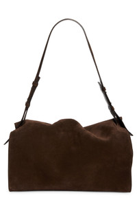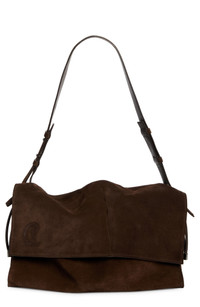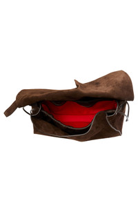 An embossed CL Mooncrest logo brings subtle branding to this roomy shoulder bag designed in a gorgeously slouchy silhouette in velvety suede. A Louboutin-red lining puts the designer's signature stamp on the look. Flap closure Adjustable shoulder strap Dual interior compartments with center drawstring-pocket divider; zip pocket Leather Made in Italy Designer Handbags
