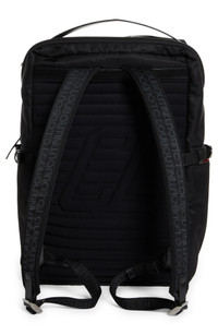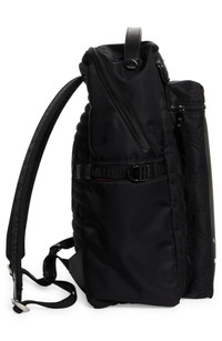 The signature rubber sole from the maison's athletic-style footwear fronts this spacious backpack featuring plenty of pockets and spike-detailed zipper pulls. Two-way zip-around closure Top carry handle; adjustable backpack straps Exterior zip pocket; side bottle pockets Adjustable side tabs Mesh back panel Signature-red lining Textile/rubber Made in Italy