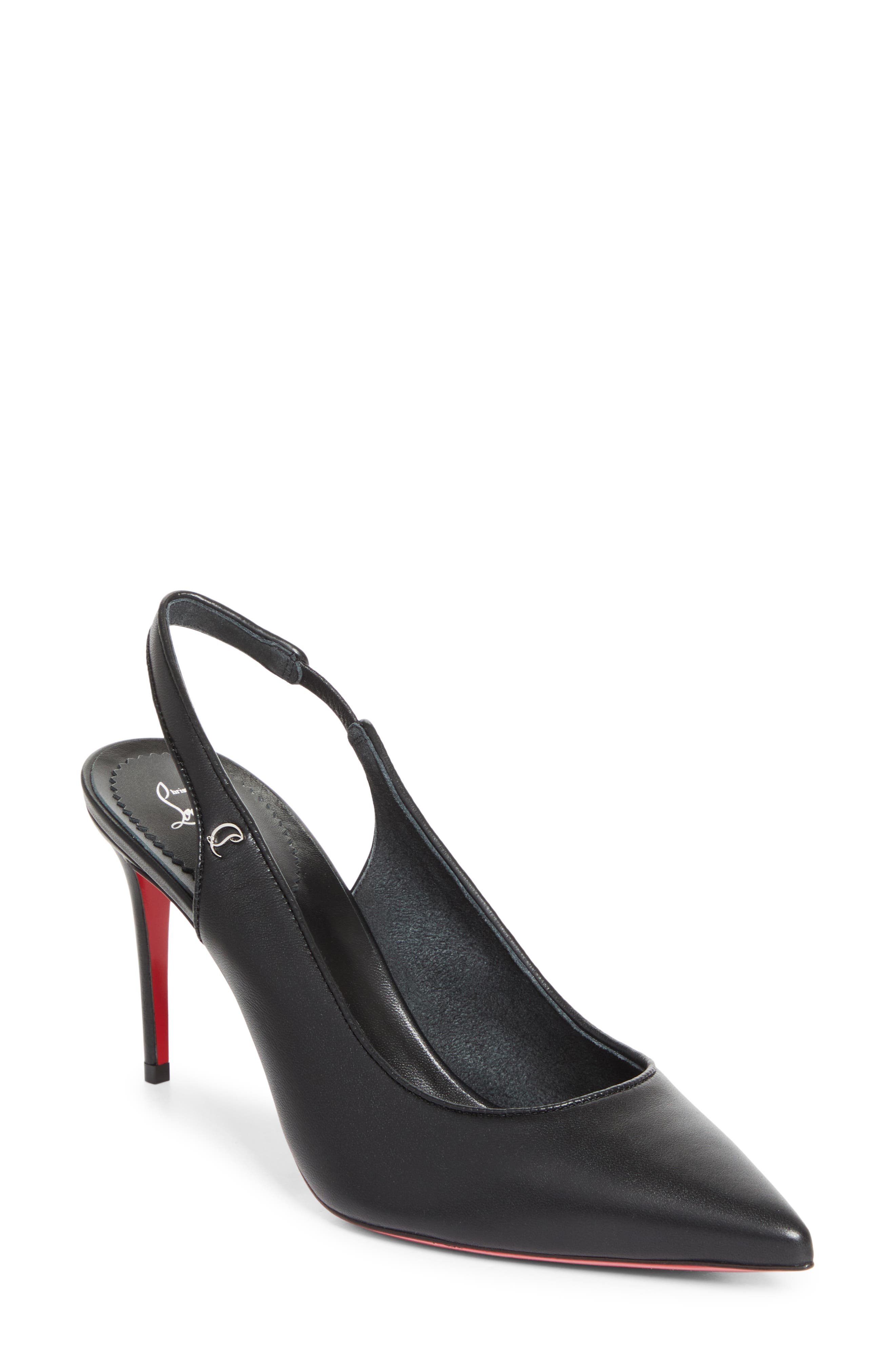 This slingback version of the Sporty Kate pump is defined by its streamlined, seductive silhouette, willowy stiletto and signature red-lacquered sole. 3 1/4" (85mm) heel Wipe with a soft, dry cloth and store in a dust bag Please note the red lacquer on soles will wear off as a result of normal use. To minimize the effect, avoid wearing in wet weather or on abrasive surfaces Leather upper, lining and sole Made in Italy Designer Shoes