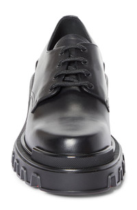 Both minimalist and maximalist, this square-toed leather derby pairs the polish of black Italian leather with the rugged foundation of a chunky-lugged rubber tread. Christian Louboutin's iconic red sole underscores each step with a flash of standout color. Lace-up style Wipe with a soft, dry cloth and store in a dust bag Leather upper and lining/rubber sole Made in Italy Designer Shoes