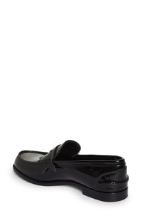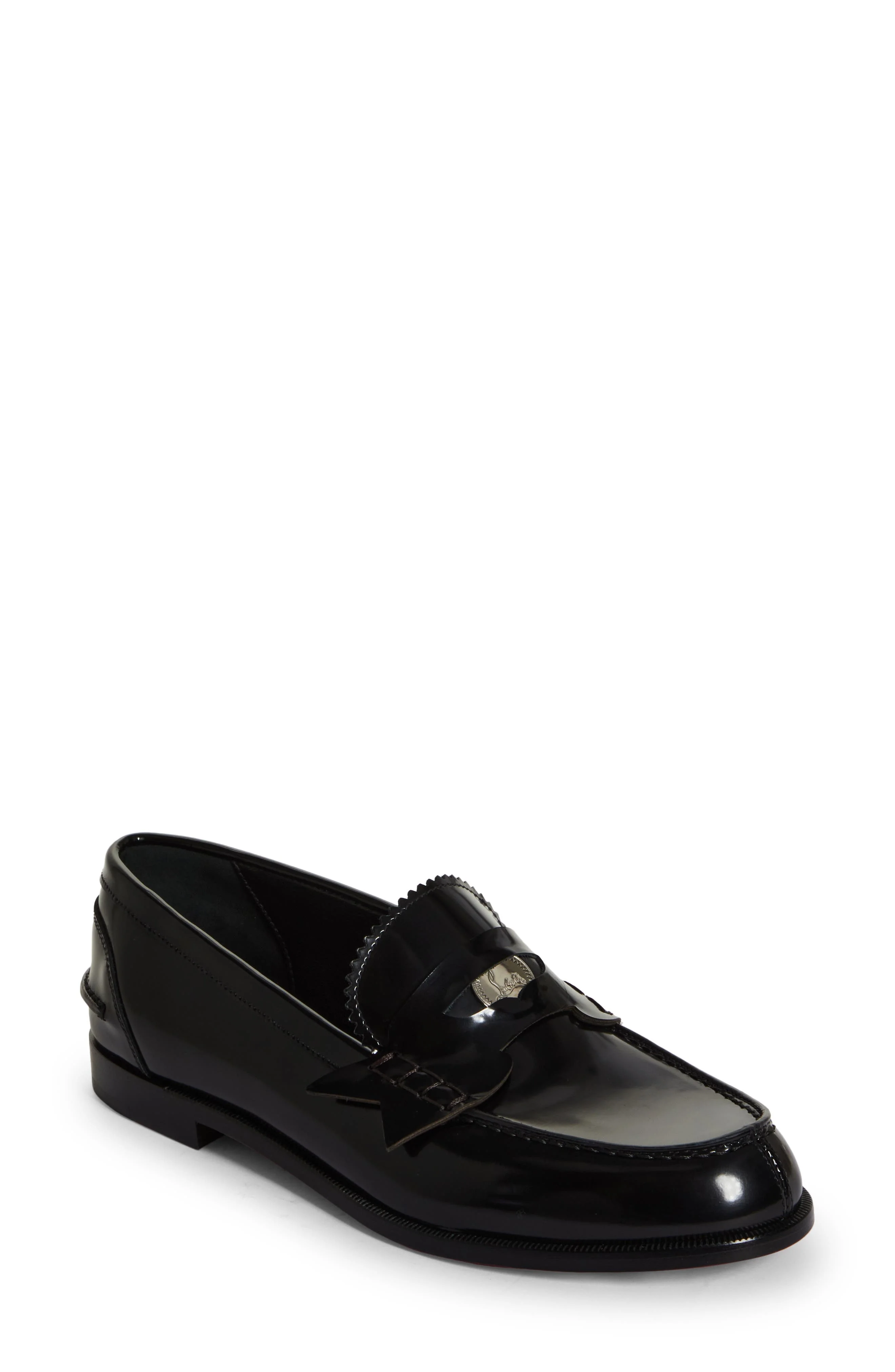 A banner-inspired forked keeper strap secures a logo-embellished coin on this timeless penny loafer crafted of burnished calfskin leather. That iconic Louboutin-red sole adds a flash of brilliant color to every step. Wipe with a soft, dry cloth and store in a dust bag Please note the red lacquer on soles will wear off as a result of normal use. To minimize the effect, avoid wearing in wet weather or on abrasive surfaces Leather upper, lining and sole Made in Italy Women's Designer Shoes