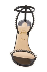 Gleaming cone studs spike the slim leather straps of this Italian-crafted sandal for a look that's barely there but boldly edgy. Christian Louboutin's signature red sole ups the impact. 4" (105mm) heel (size 8.5US / 38.5EU) Adjustable ankle strap with buckle closure Wipe with a soft, dry cloth and store in a dust bag Please note the red lacquer on soles will wear off as a result of normal use. To minimize the effect, avoid wearing in wet weather or on abrasive surfaces Leather upper, lining and sole Made in Italy Women's Designer Shoes