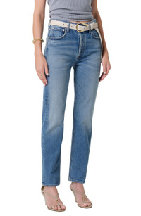 A clean look for casual outfits, these high-rise straight-leg jeans are made with sustainably sourced fibers and a hint of stretch. 29" inseam; 15" leg opening; 11 3/4" front rise Button fly Five-pocket style 99% regenerative cotton, 1% elastane Machine wash, tumble dry Made in Turkey