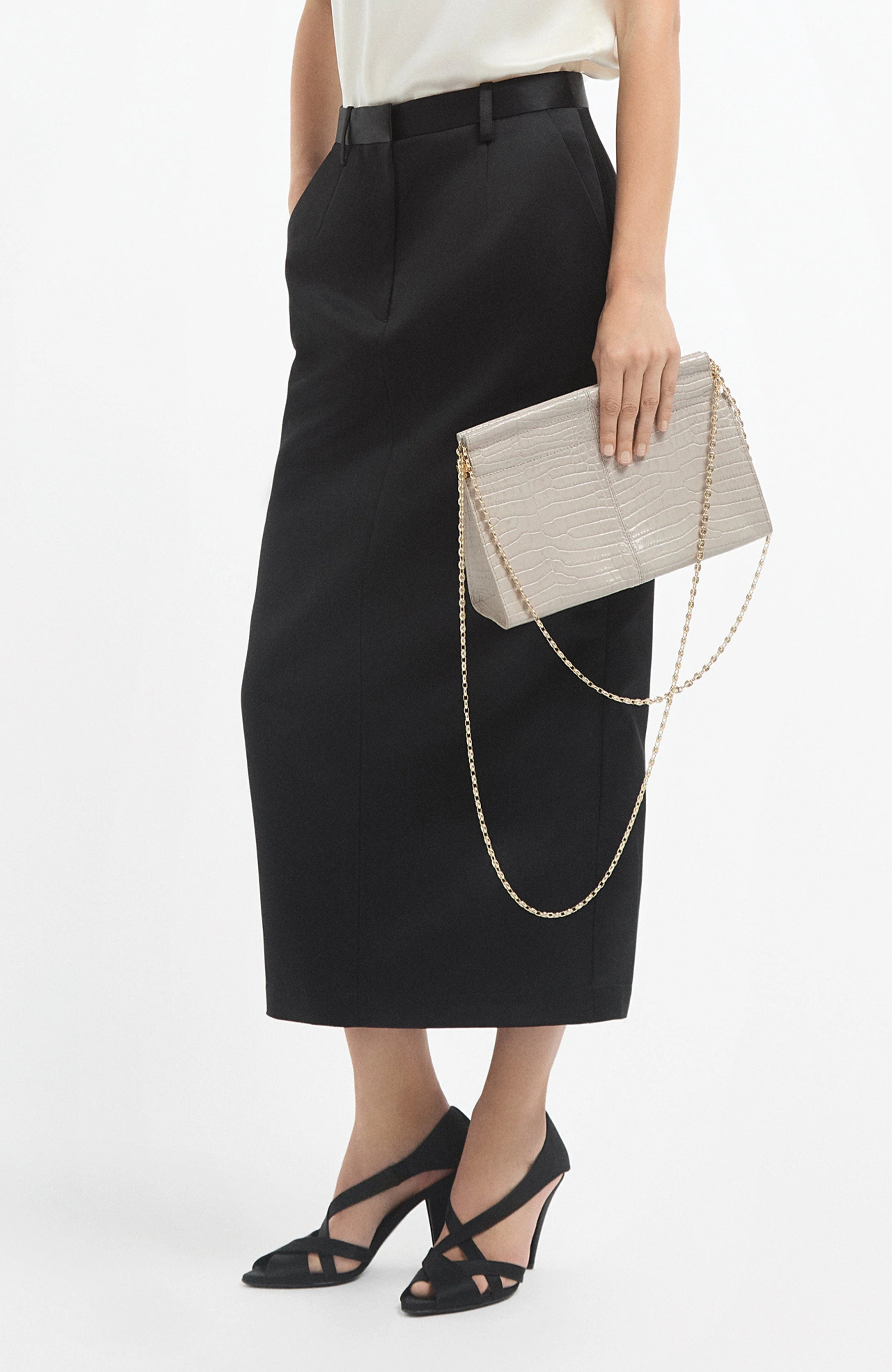 Crafted from lustrous duchess satin, this tailored midi skirt features a front zipper closure, belt loops, and back welt pockets. Designed with clean lines and a center vent for ease of movement, it brings modern structure and understated sophistication to everyday dressing. 100% Polyester Dry Clean Only Side Pockets Front Zipper Closure Belt Loops Designed to sit at the natural waist Midi length with a center back slit for ease of movement Measures 32" in length Model Height is 179 cm / 5'11 in