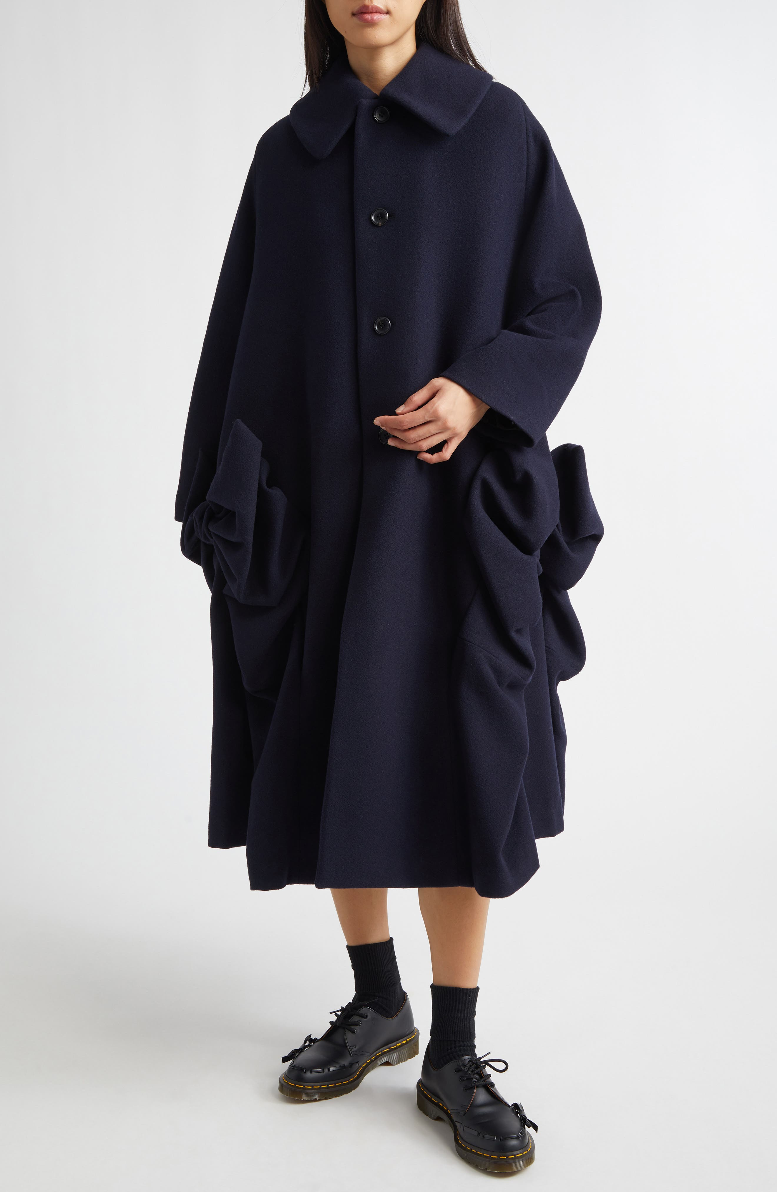Rei Kawakubo riffs off prim prep-school uniforms through her avant-garde lens with this boxy, calf-grazing coat with artfully ruched, draped and tucked side seams for otherworldly volume. Front button closure Spread collar Lined 90% wool, 10% nylon Dry clean Made in Japan Designer Clothing Asian & Pacific Islander Owned/Founded