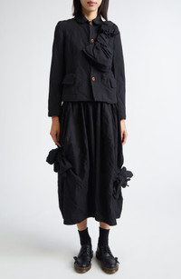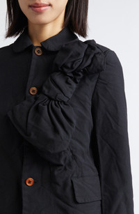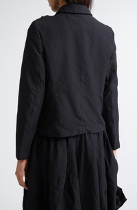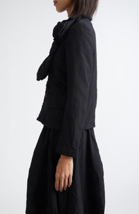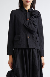 Rei Kawakubo playfully deconstructs prim prep-school uniforms in this trim oxford jacket sweetened with an oversized bow and Peter Pan collar. Front button closure Peter Pan collar Front flap pockets Satin lining 100% polyester Dry clean Made in Japan Designer Clothing Asian & Pacific Islander Owned/Founded