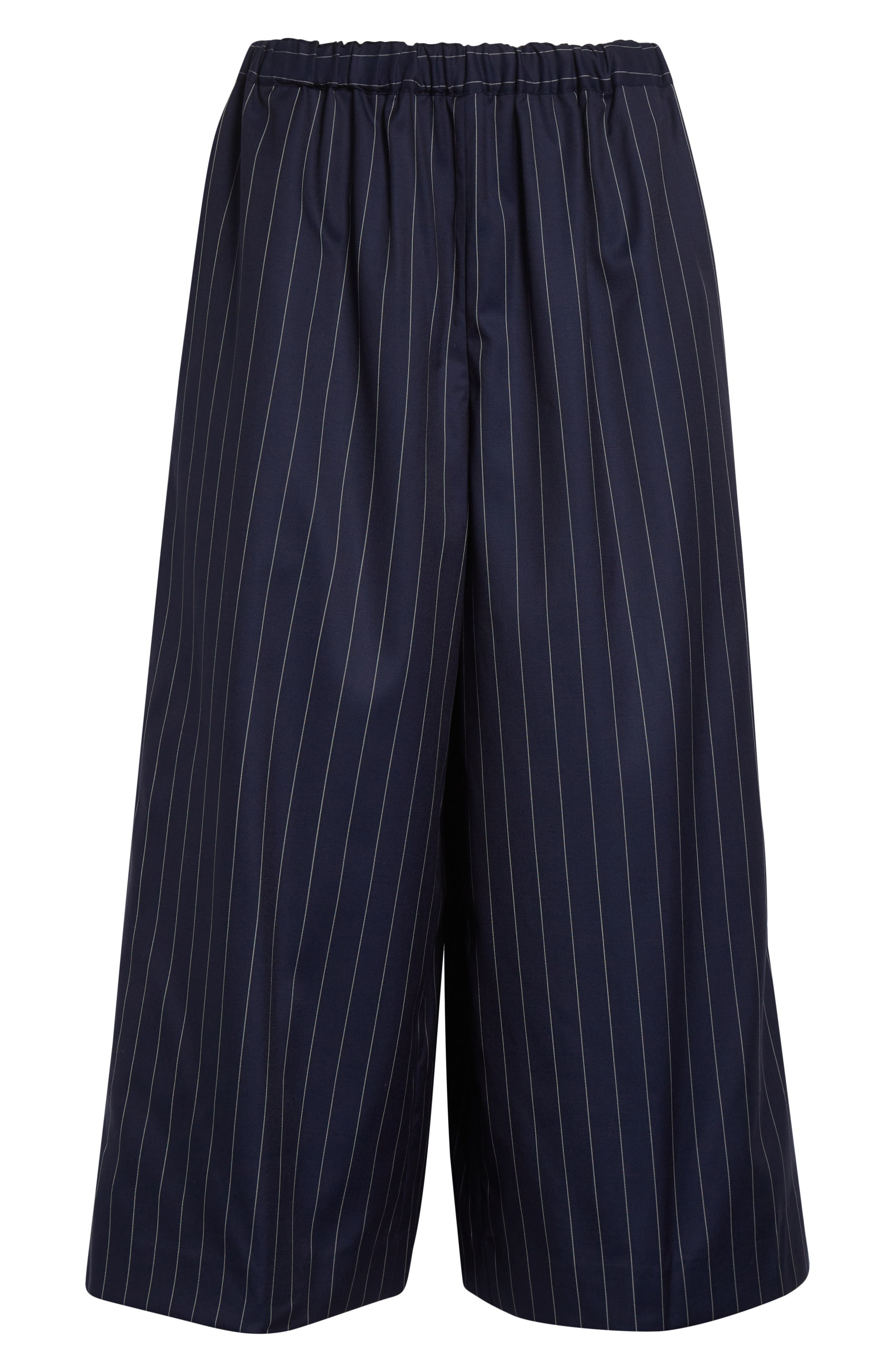 Forget business as usual. Rei Kawakubo remixes the typical 9-to-5 pinstripe trousers through her avant-garde lens in this pull-on style tailored in a dramatic wide-leg silhouette from a silk-softened wool blend. Elastic waist 83% wool, 16% silk, 1% polyester Dry clean Made in Japan Designer Clothing Asian & Pacific Islander Owned/Founded