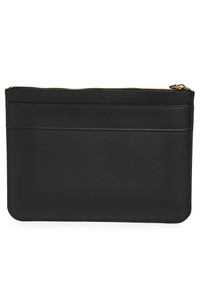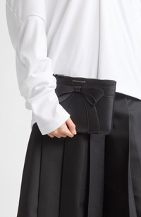 Gilt logo lettering and a big bow add a signature finish to a supple calfskin-leather pouch secured with a gleaming goldtone zip—perfect for organizing small essentials. Top zip closure Back hand strap Unlined Leather Made in Spain Designer Handbags Asian & Pacific Islander Owned/Founded