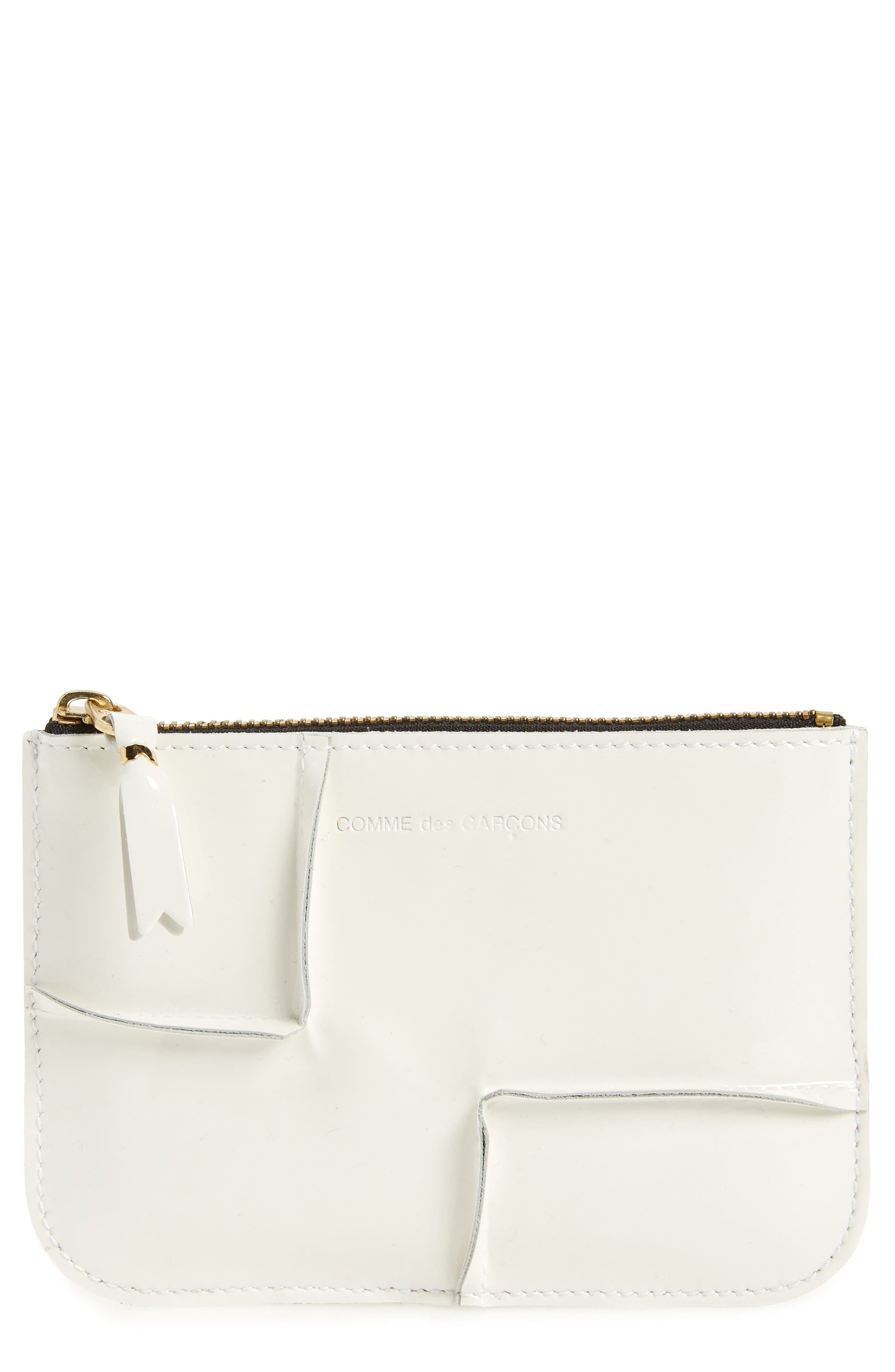 Raised-seam detailing brings a tactile element to this compact zip-top pouch crafted of glossy patent leather. Top zip closure Leather Made in Spain Designer Handbags