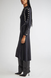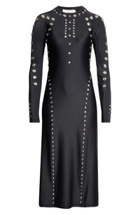 Expertly engineered in a second-skin fit, this smooth jersey midi dress is embellished with silvery snaps for an ultrafuturistic, avant-garde look a la tres chic cyborgs from the French design duo's sci-fi realm. Crewneck Long sleeves 78% polyamide, 22% elastane Dry clean or machine wash, dry flat Made in Portugal Designer Clothing
