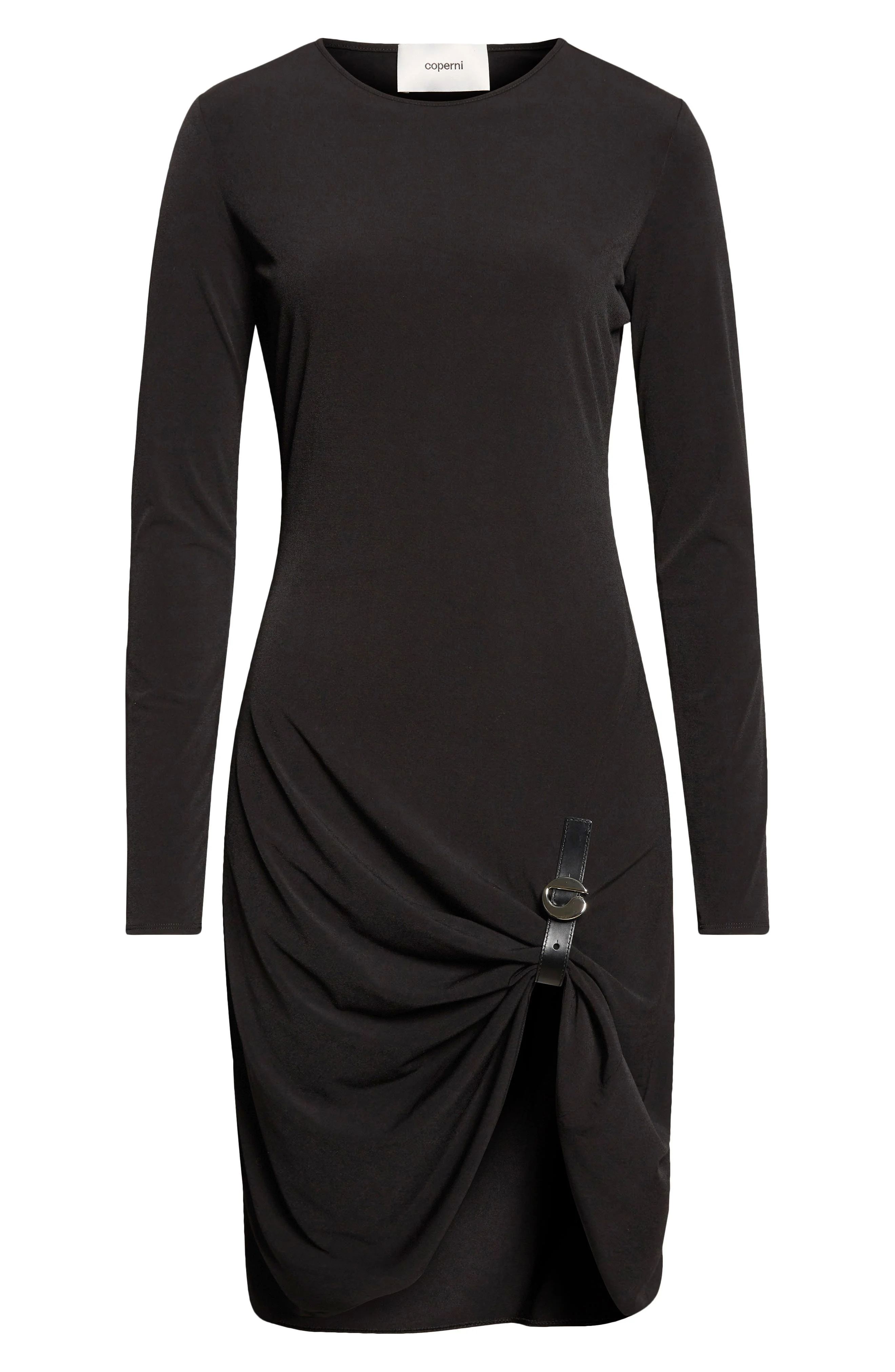 For fall '25, the French design duo tilts the closet-staple LBD into nocturnal territory in this curve-contouring jersey dress with a glossy leather band that seductively hikes up the hem with rippled ruching. Jewel neck Long sleeves 95% polyester, 5% spandex Dry clean or machine wash, dry flat Made in France Designer Clothing