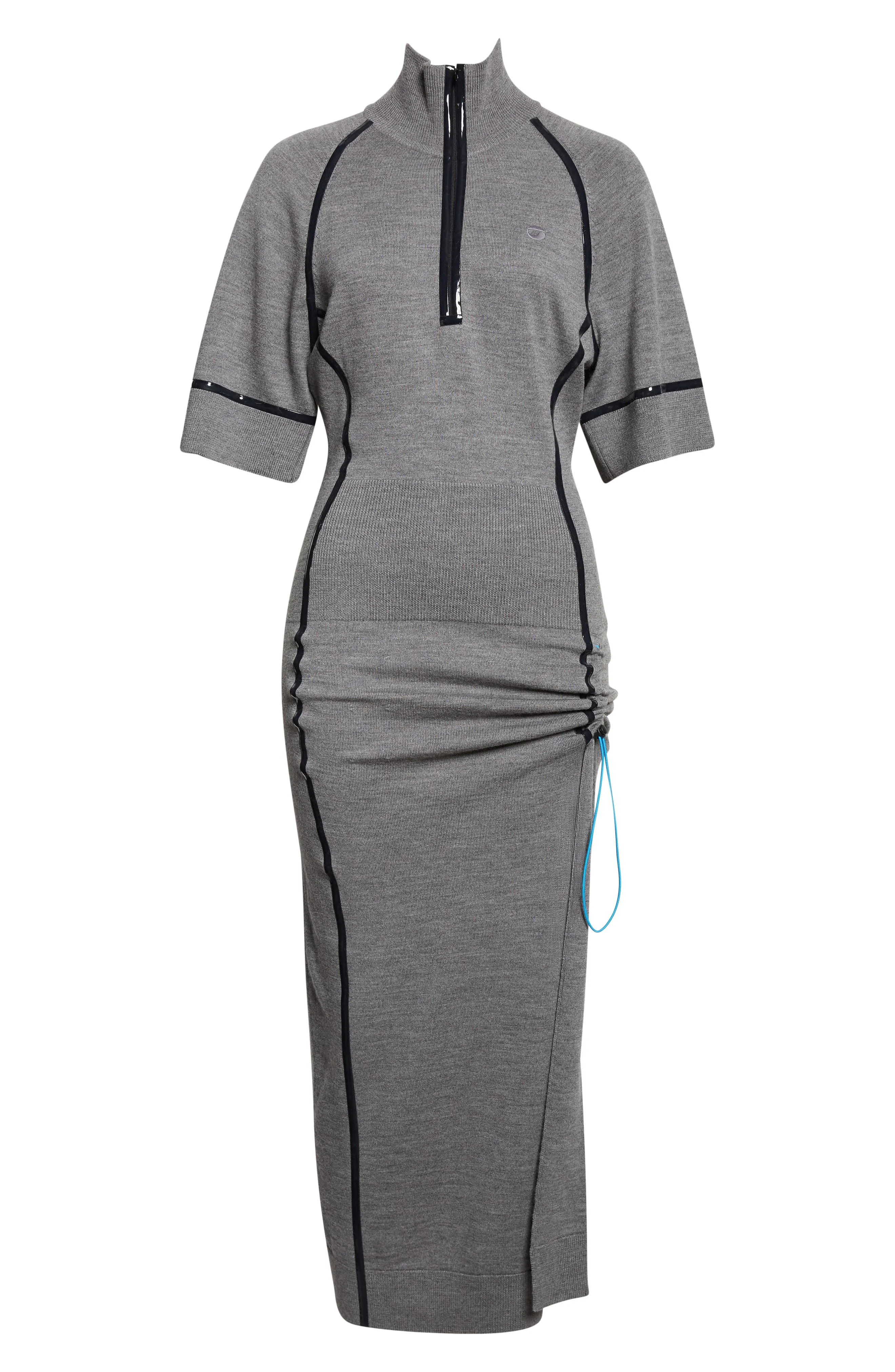 Performance merino wool adds to the athletic-chic look of this midi that begins as a tech-bro-esque half-zip and finishes with a drawcord-toggle adjustable side slit. Half-zip closure Funnel neck Elbow-length sleeves Side slit 100% merino wool Dry clean or machine wash, dry flat Made in Italy Designer Clothing