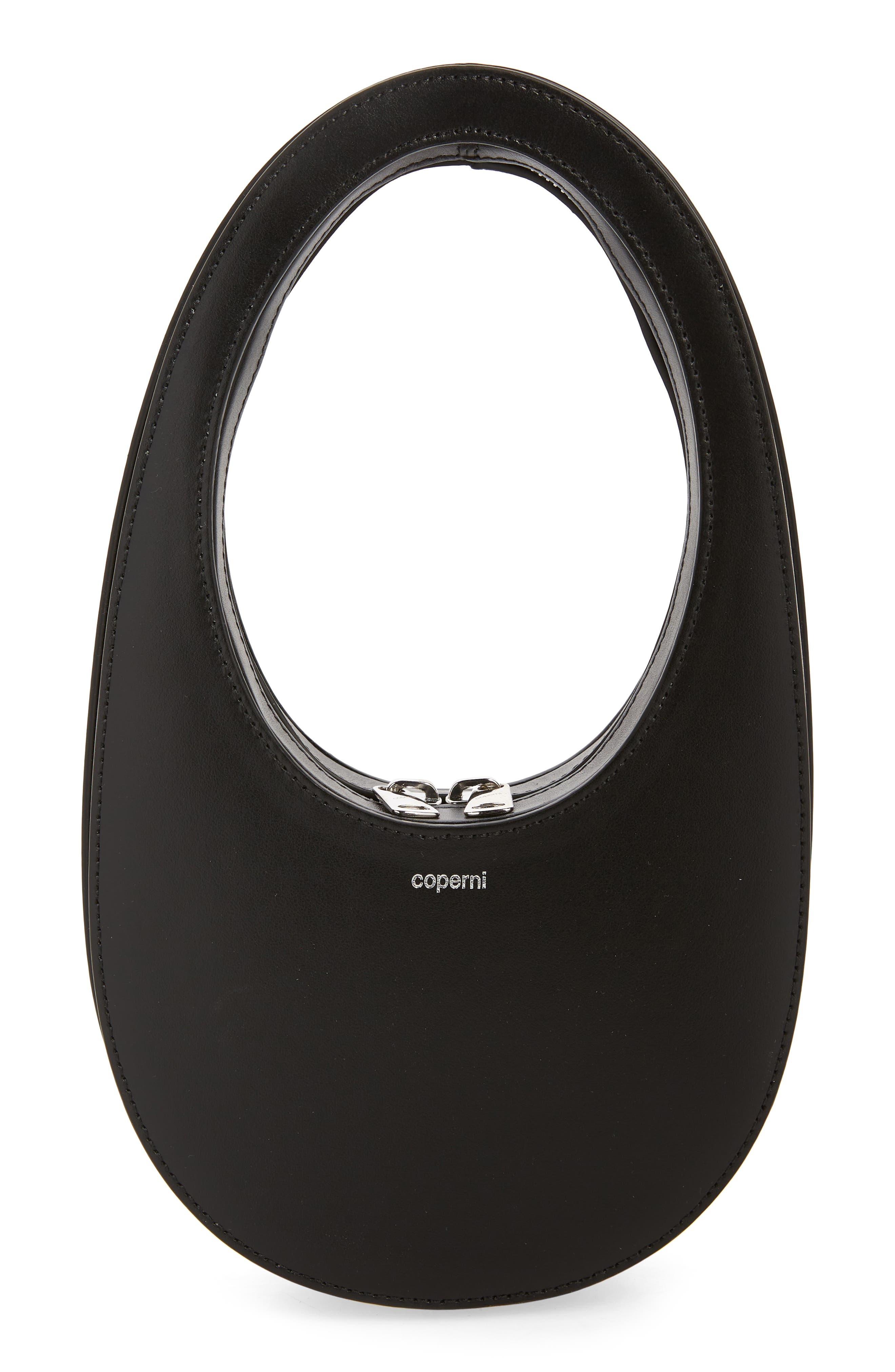 This runway-featured bag is updated for the season in minimalist black for a sleek, sculptural look that toys with futuristic fancy. The bag's geometric silhouette is inspired by the minimalist 'swipe' icon that unlocks many of today's phones. Two-way top-zip closure Top carry handles Lined Leather Made in Italy Designer Handbags
