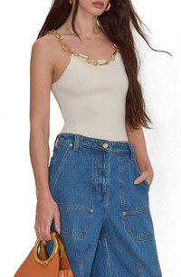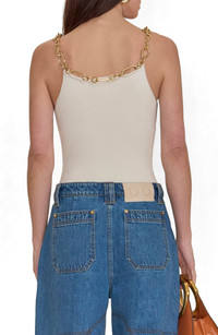 This trim-fitting cami is held in place with shiny goldtone chain straps that encircle the neckline for an unexpected chic look that you won't want to cover up. Jewel neck 79% viscose, 21% nylon Dry clean Imported
