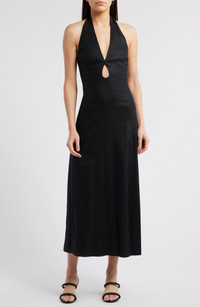 Sleek cutaway shoulders frame this lightweight linen-blend maxi designed in a flared silhouette and updated with sultry details like a plunging neckline and an eye-catching open back. Adjustable back tie closure Halter neck 58% linen, 40% rayon, 2% spandex Dry clean Imported