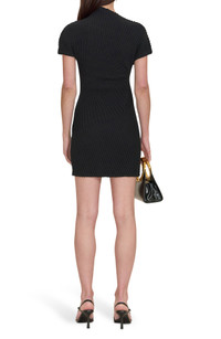 An unexpected asymmetric mock neck tops a short-sleeve mini dress made from cotton and featuring engineered ribs that curve to highlight your shape. Slips on over head Mock neck Short sleeves 100% cotton Dry clean Imported