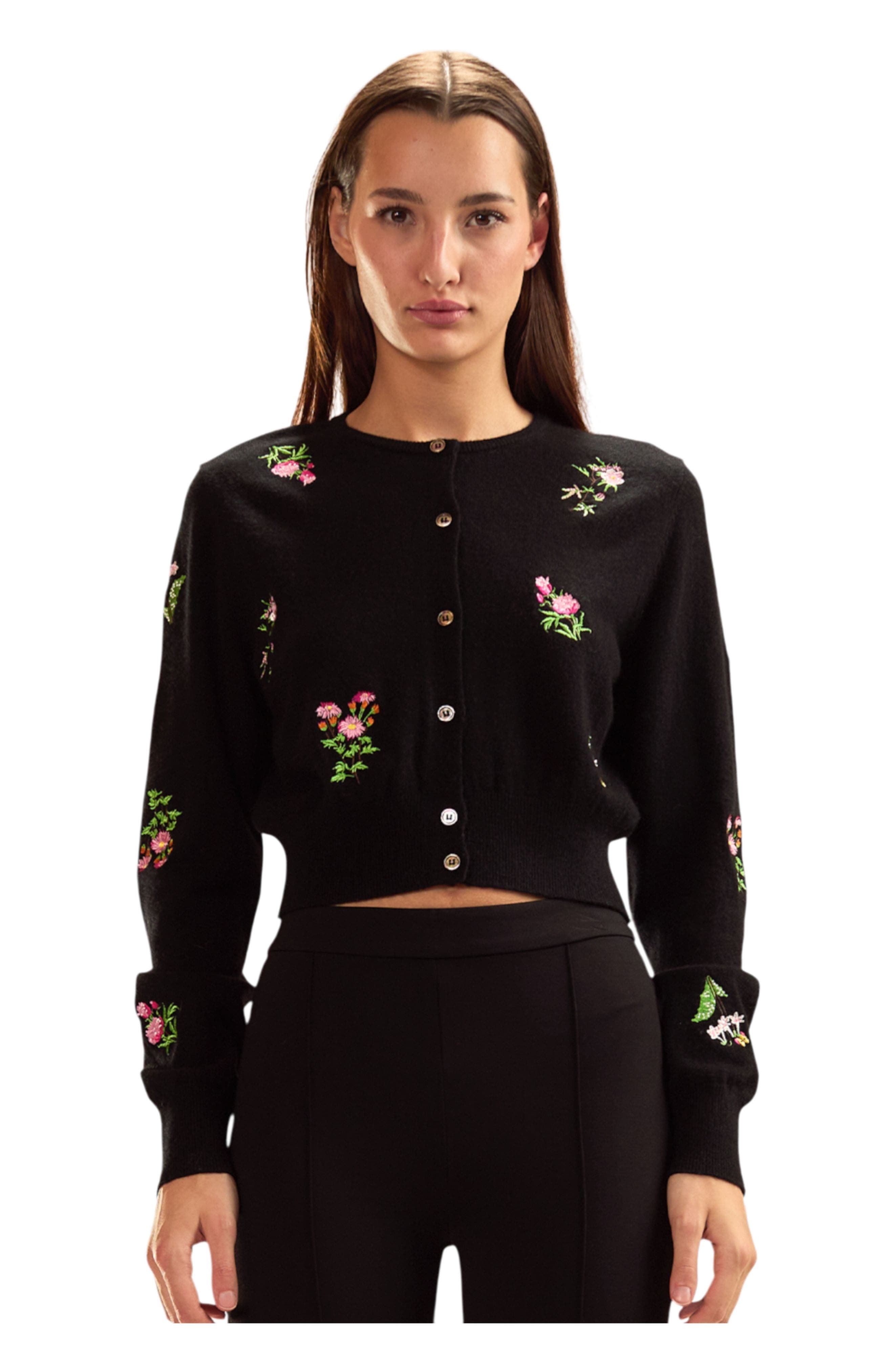 Pretty floral embroidered baby cashmere cardi. Cute enough to wear solo, but also loves layering. Spring/Summer 25 Composition: 70% Wool, 30% Cashmere Everyday wear
