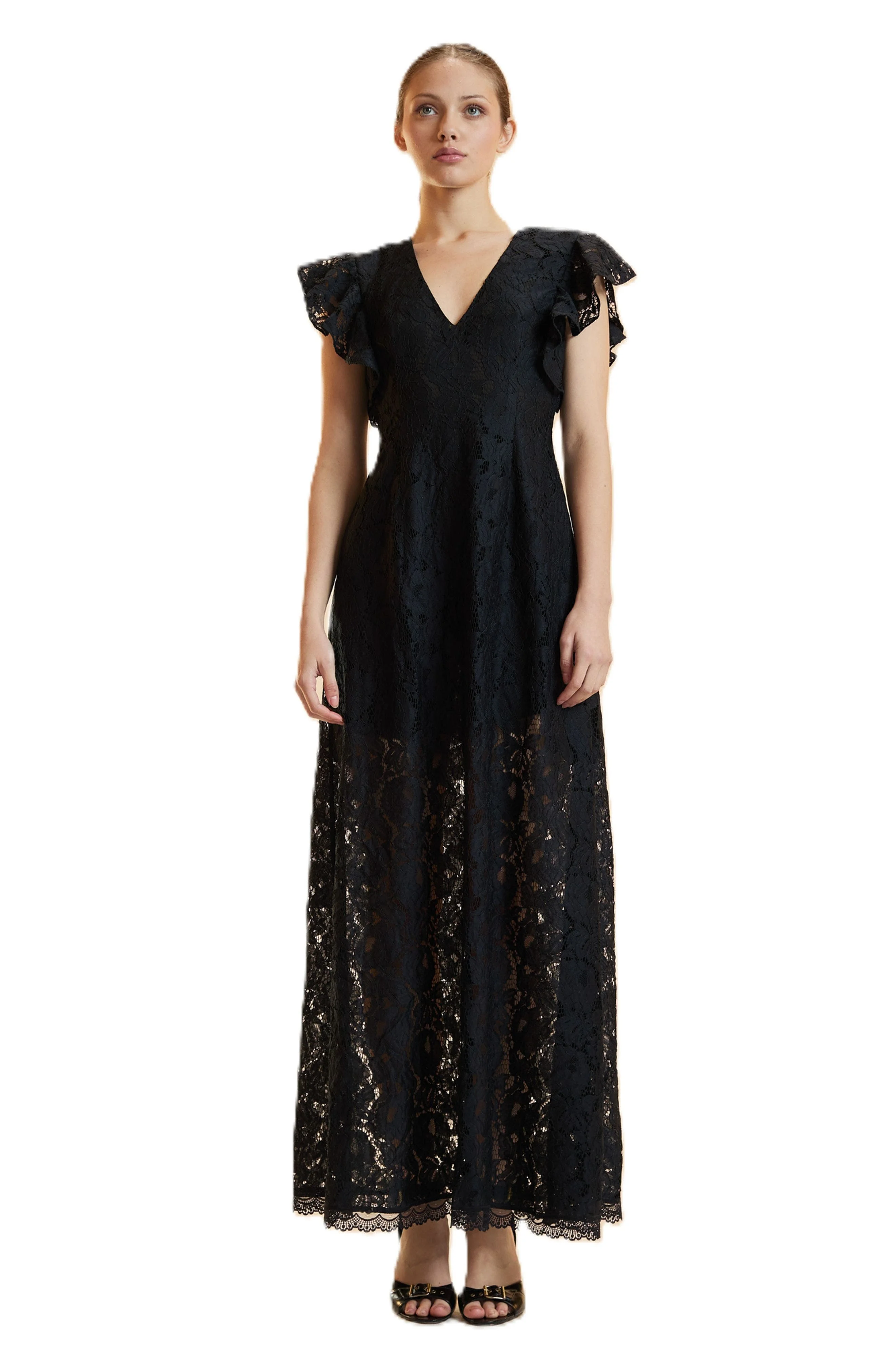 Soft lace, flutter sleeves, and a perfectly feminine silhouette. This dress floats with every step—pretty, polished, and made for moments you want to remember. Wear it from daytime plans to candlelit nights. Sheer lace overlay Flutter sleeves; V‑neck bodice Back zip; partial lining