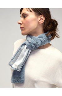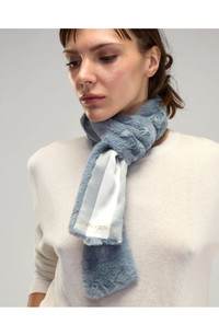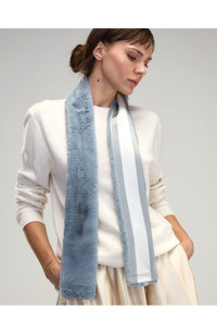 FUR SILK SCARF Luxurious faux fur with soft silk panel Striped detailing for a sophisticated touch Perfect length for knotting, wrapping, or draping