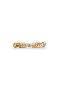 Enhance your shine with an elegantly twisted ring illuminated by pave diamonds and fluid, polished lines. 4mm band width Total diamond weight: 0.08ct. 18k gold/diamond Imported >Diamond Guide