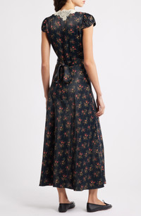Tiny blooms tumble across a lustrous satin maxi edged in delicate lace and easy to style up or down. Slips on over head Deep V-neck Short sleeves Attached sash 100% viscose Dry clean Imported