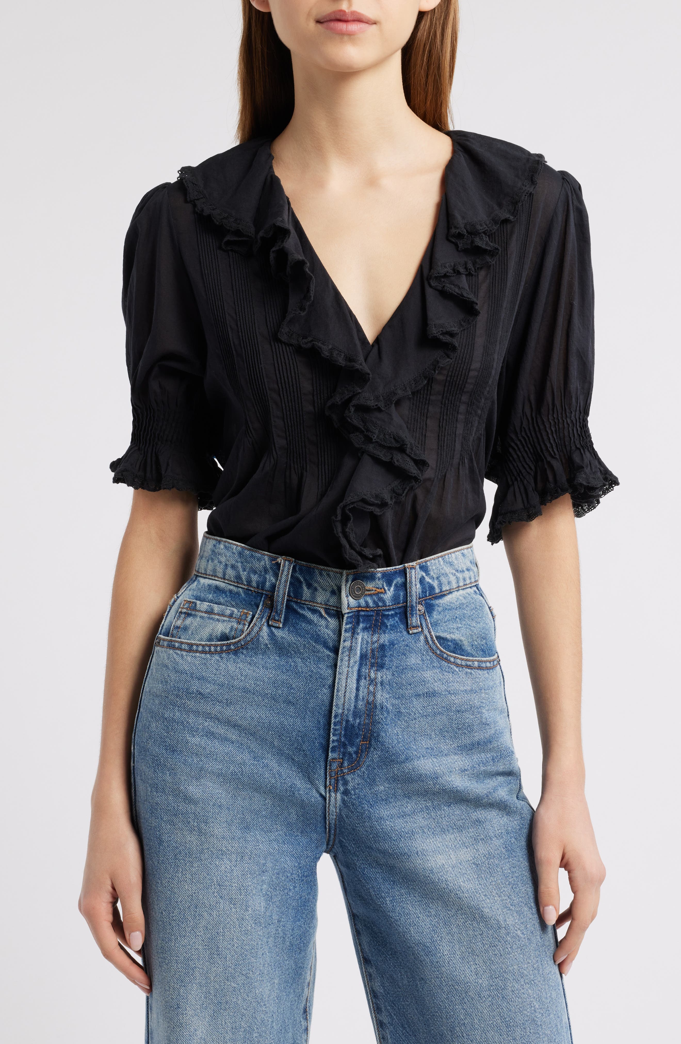 The cult-favorite Cali label's retro/romantic aesthetic pervades every stitch of this ever-enchanting organic-cotton voile top decorated in cascading, lace-trimmed ruffles and scores of delicate pintucked pleats. Hidden-button placket Deep V-neck Short sleeves 100% organic cotton Dry clean or hand wash, line dry Imported