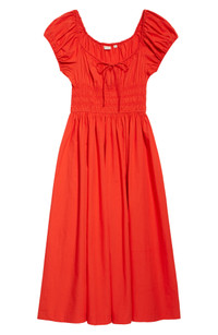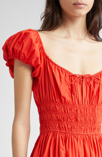 Breeze through sunny weekends and vacay plans in this organic-cotton poplin dress rooted in the cult-favorite Cali label's retro/romantic signatures—think puff sleeves, intricate shirring and a dainty bow bridging the keyhole cutout. 52 1/2" length (size Medium) Front keyhole with tie closure Scoop neck Short sleeves 100% organic cotton Dry clean or hand wash, dry flat Imported