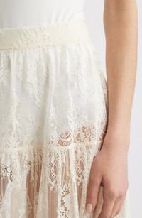 The cult-favorite Cali label's retro/romantic aesthetic pervades every stitch of this enchanting tiered midi skirt fashioned from exquisite floral lace inspired by an Edwardian bridal trousseau. 35" length (size Medium) Hidden side-zip closure 53% nylon, 47% cotton Dry clean or hand wash, dry flat Imported