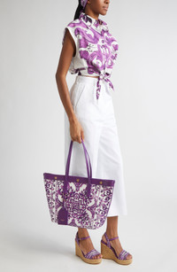 A purple print inspired by hand-painted majolica tiles emboldens this spacious tote crafted of cotton canvas and trimmed with smooth leather. Magnetic-snap closure Shoulder straps Interior zip pocket Textile/leather Made in Italy Designer Handbags